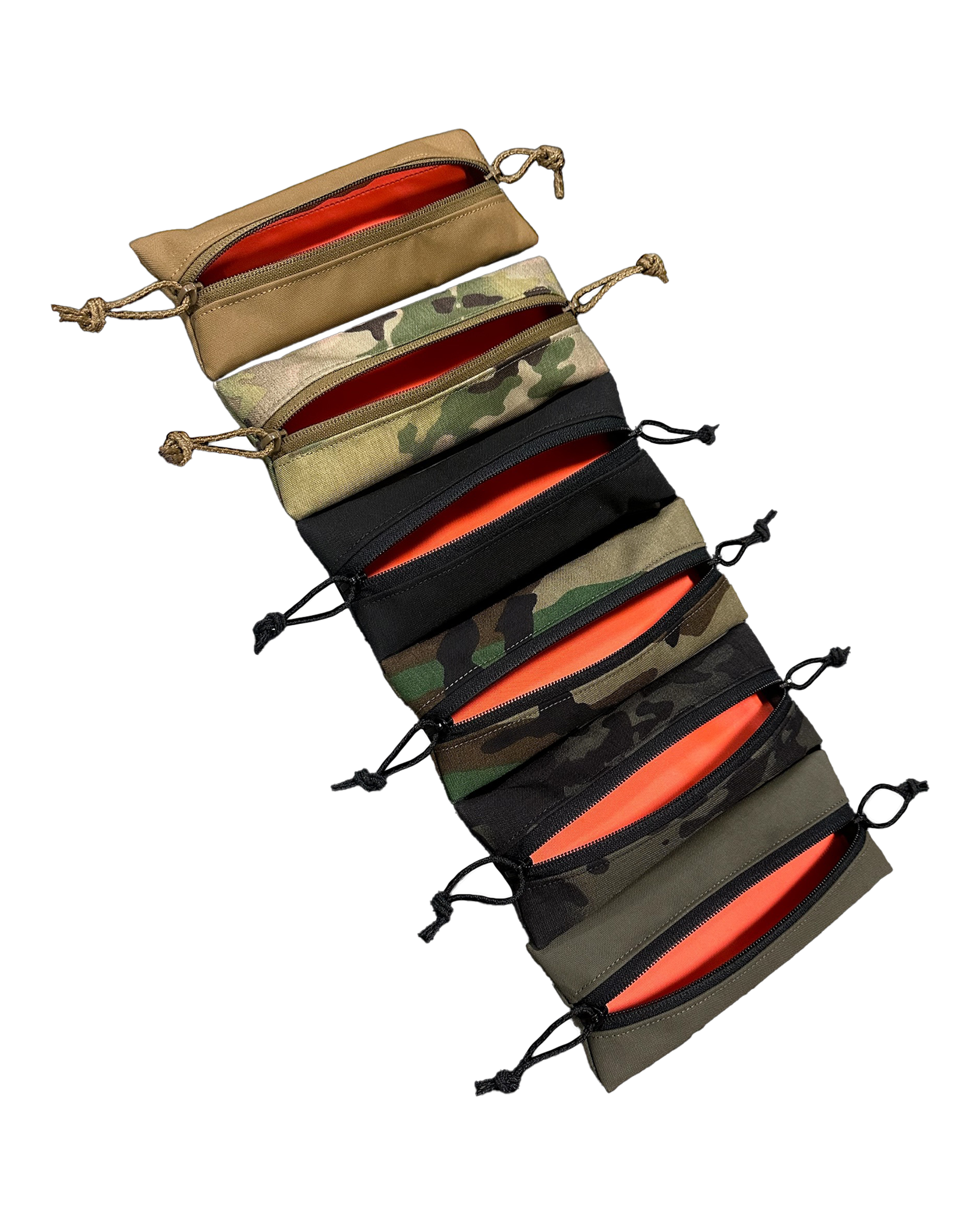 A 3” x 8” zipper pouch with an internal Curv stiffener and hi-vis interior liner. Ideal for holding small items - rifle cleaning kit, 550 cord, chemlights, small hand tools, etc. fits in a 5.56 mag insert. 500D with Posi-Lock zipper pulls.