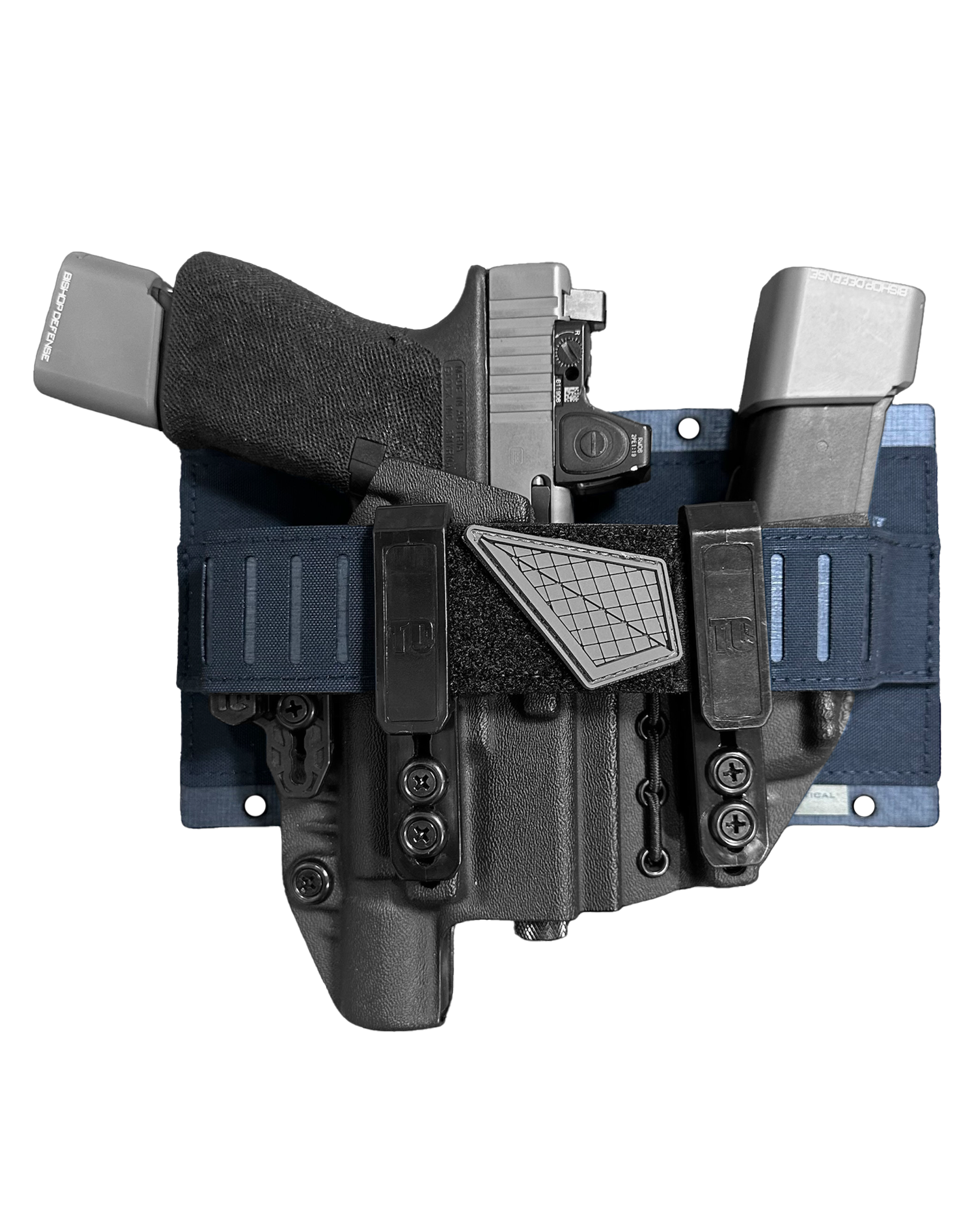 Fits a pistol holster with spare magazine. Thermoplastic panel with Squadron that is hook Velcro backed for mounting inside a pack or concealed carry bag. Allows the pistol to stay inside an appendix holster which provides protection and keeps the firearm stored in a safe, easy to draw manner. Holes on the edges allow for shock-cording to backpack organization panels, etc. Ideal for those who carry concealed and want an option to remove the entire appendix holster and store in a bag when desired.