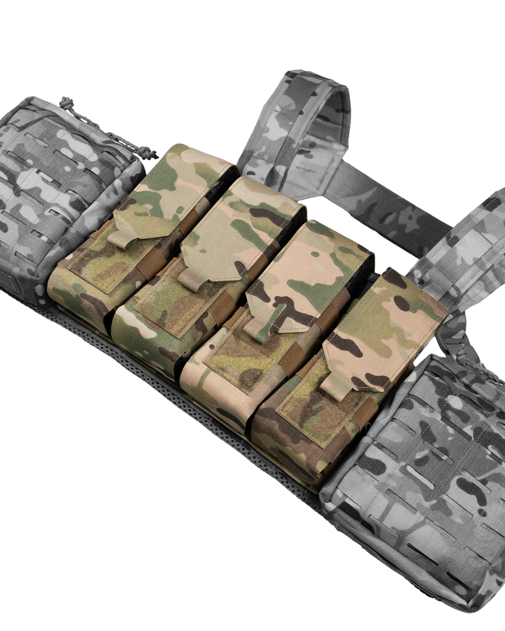 Double-Double M4 MOLLE Pouch holds TWO M4 Magazines per pouch for a total of FOUR Magazines. Each pouch has two rows of 1” elastic webbing keeping the mags snug even with one mag. Designed to work in conjunction with our MRRV Chest Rig.