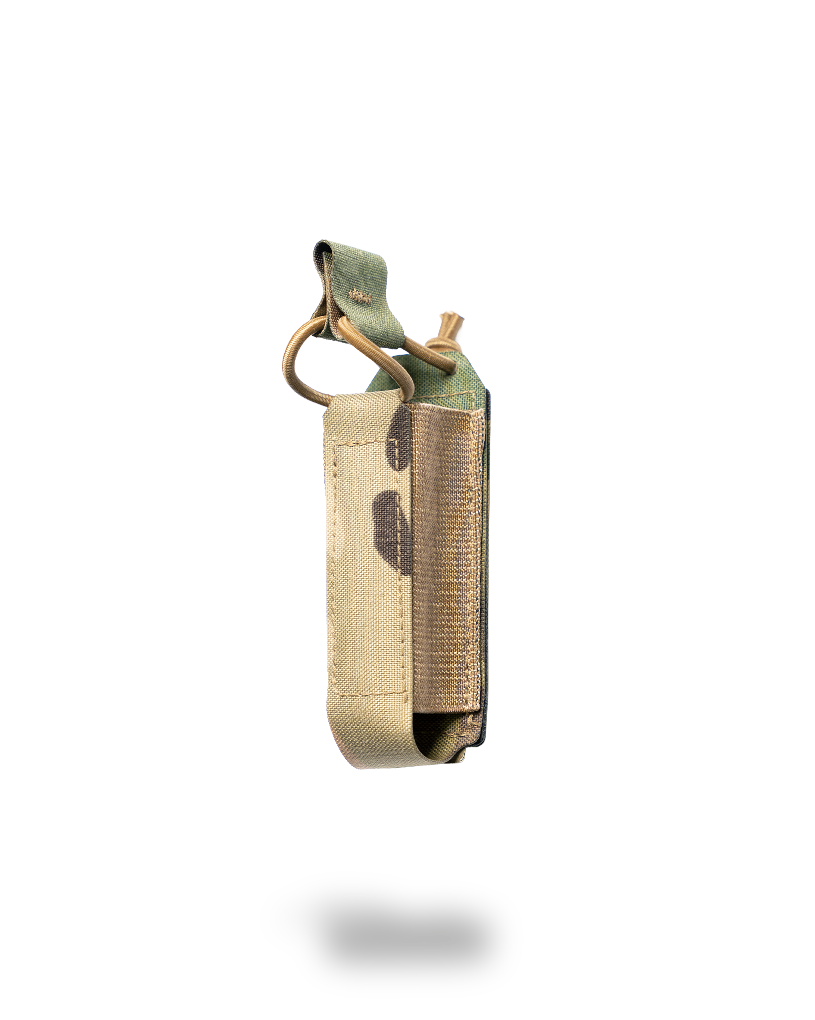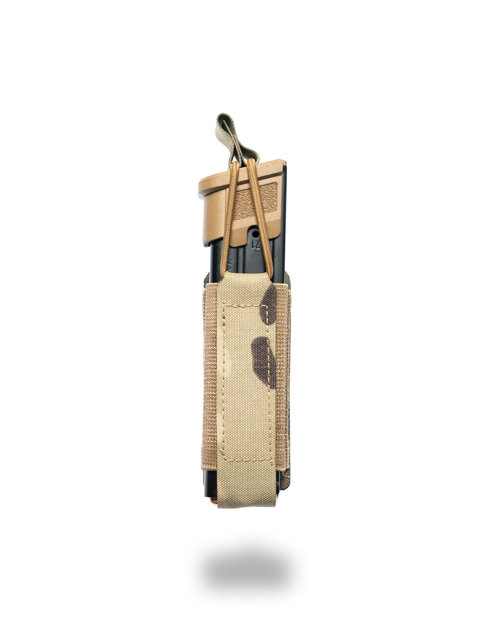 Elastic MOLLE Pouch (EMP) for pistol magazines. Mini MOLLE for belt mounting and reinforced Curv (Thermoplastic) back. Active retention kit included.