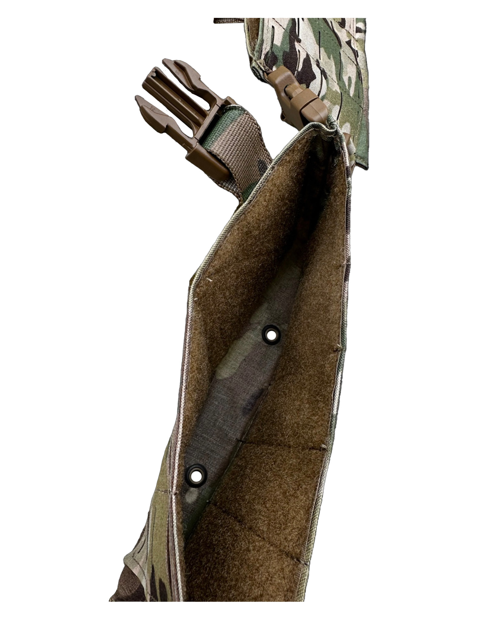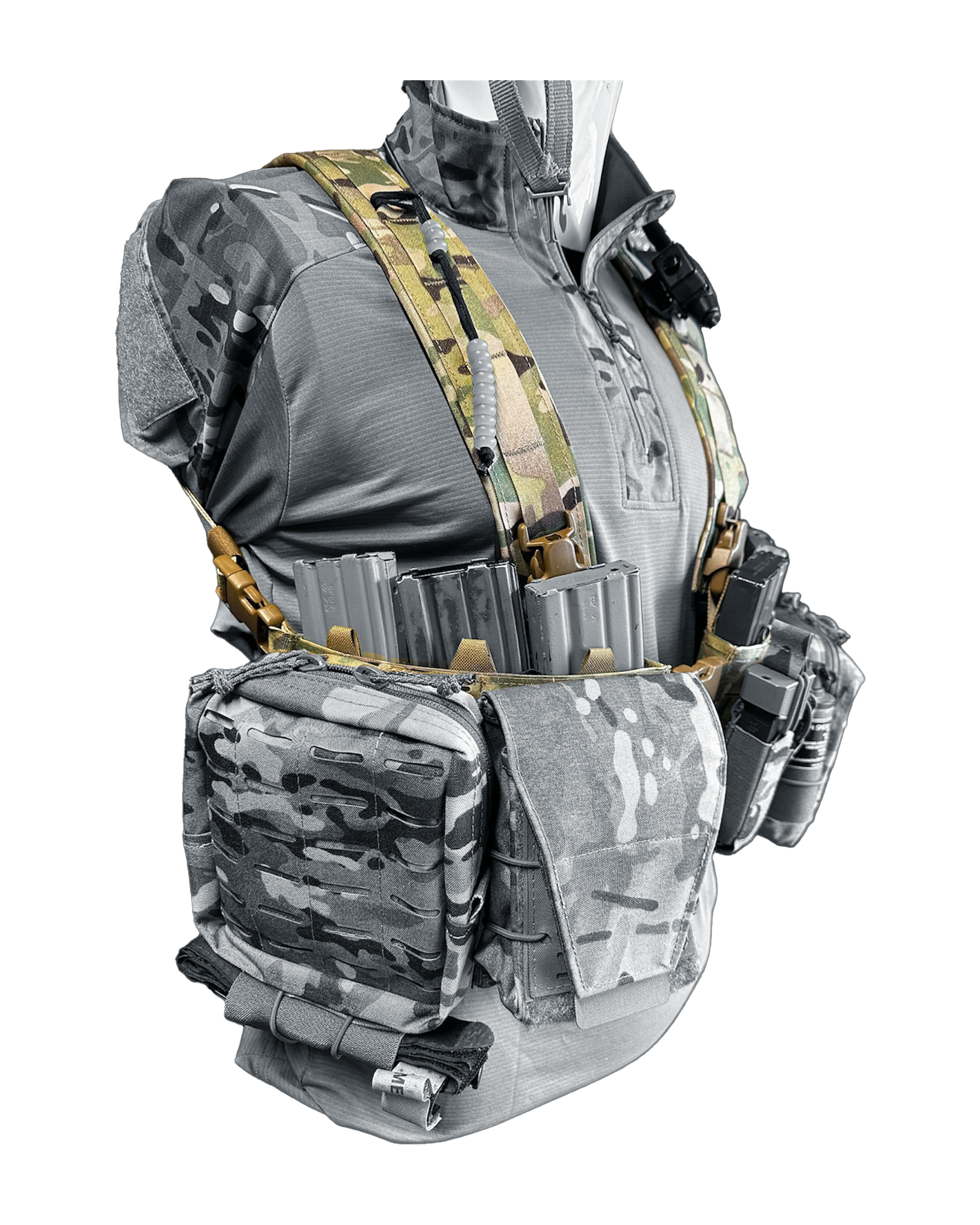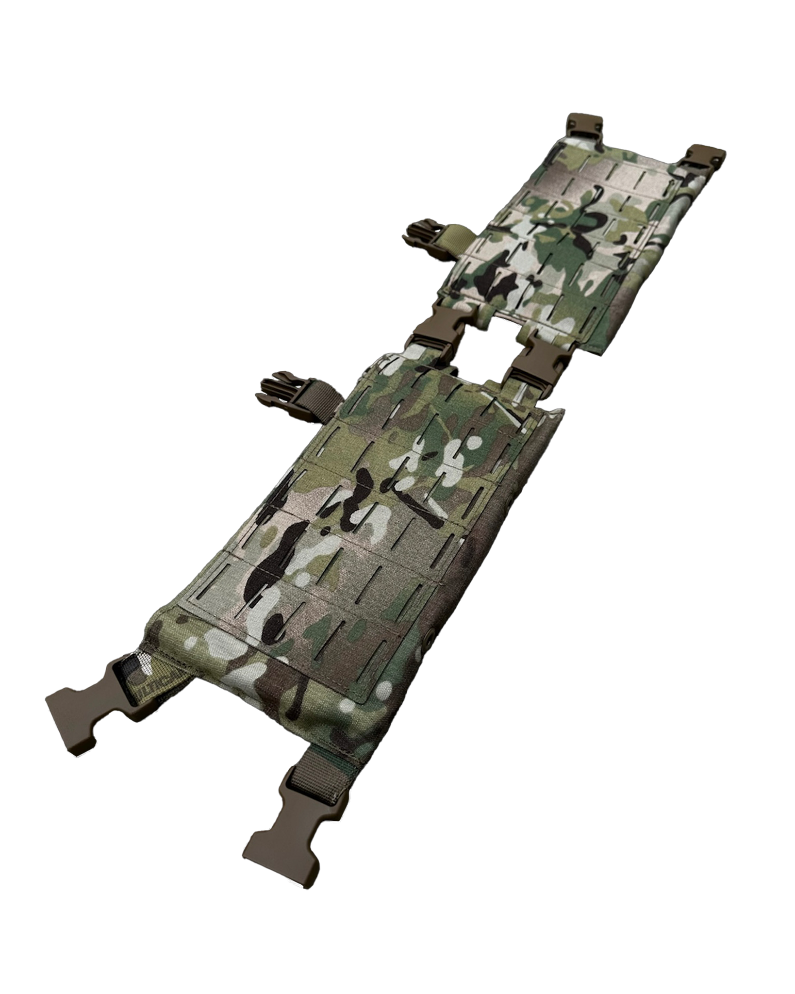 The Split Stout SCOUT chest rig consists of 2 sections of laser-cut Squadron MOLLE (6 columns x 4 rows) sewn over a 500D loop-lined pouch, each side capable of taking a triple 5.56 elastic insert, or similar sized inserts. Each side will also accept AXL Zipper Inserts. The rear of the rig also features 3 columns and 4 rows of laser-cut Squadron MOLLE for attaching radio pouches and also features 4x4 fields of Hook covered with loop backing for attaching radio wings , Crayon Boxes, etc. Front and center you have the ability to change out the type of split-bar closure system, from standard 1” buckles, Taktik buckle, or First Spear Tubes. The rig is compatible with most modern harnesses that use 1” National Molding/ITW buckles.