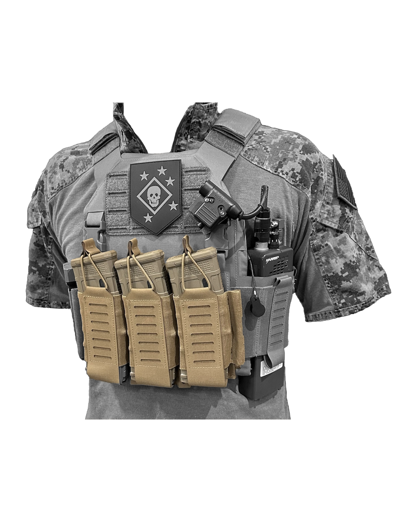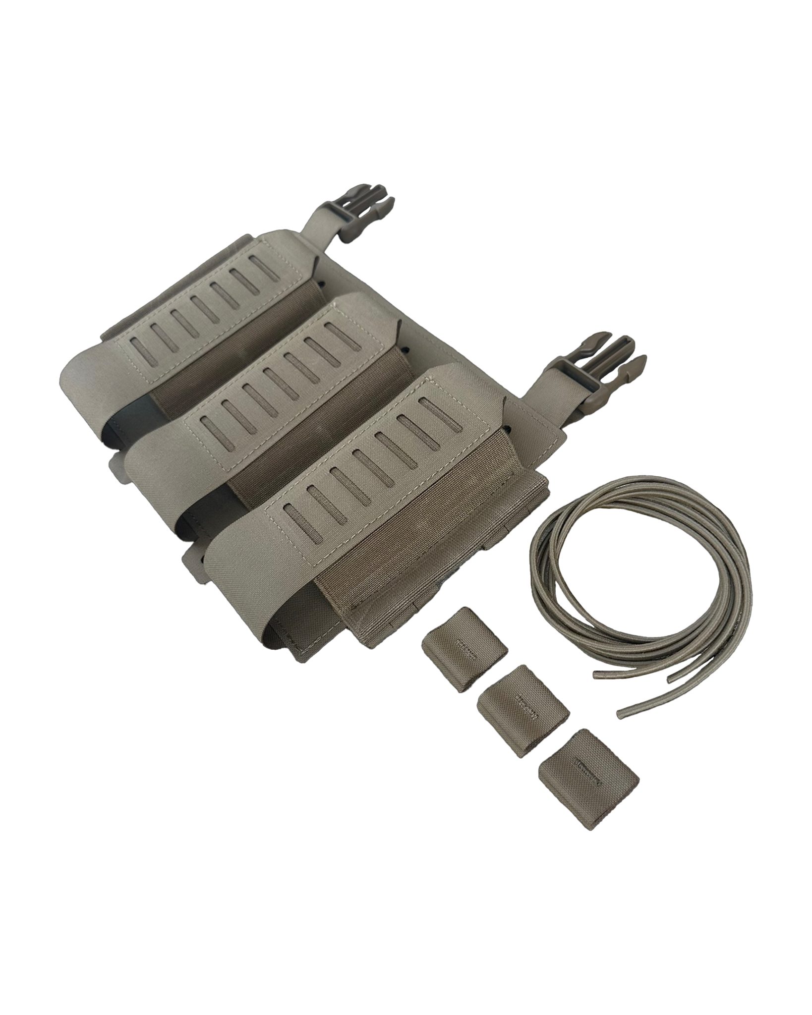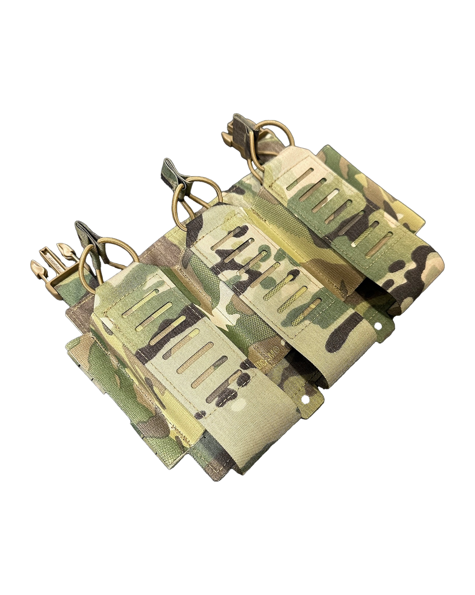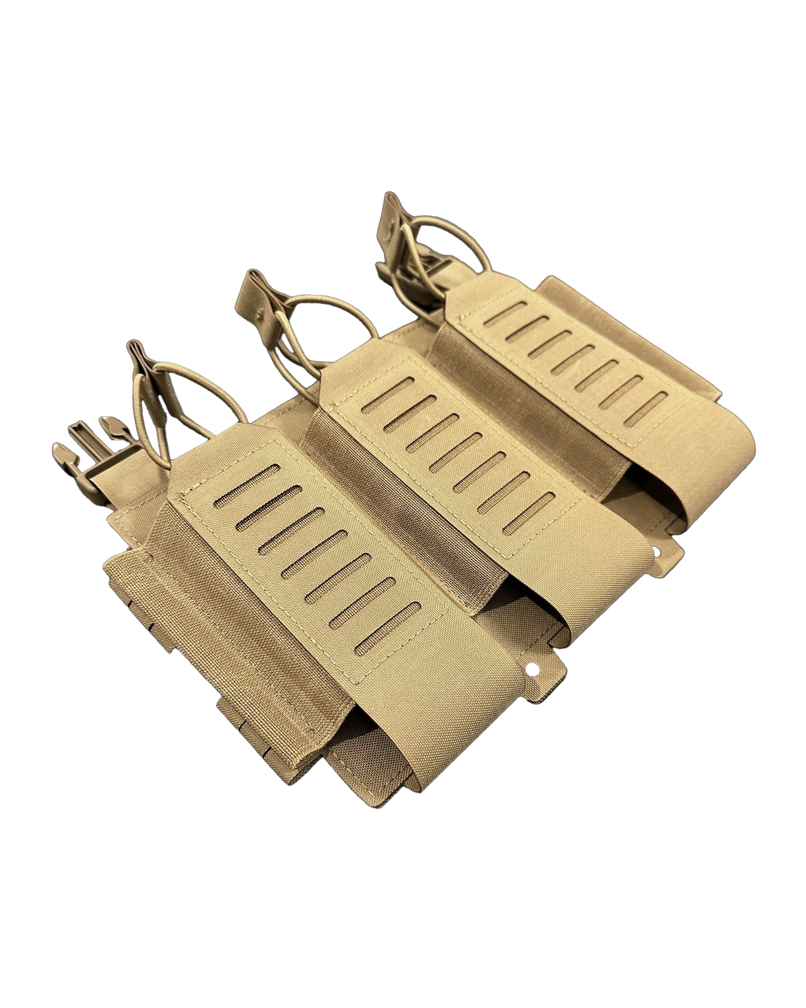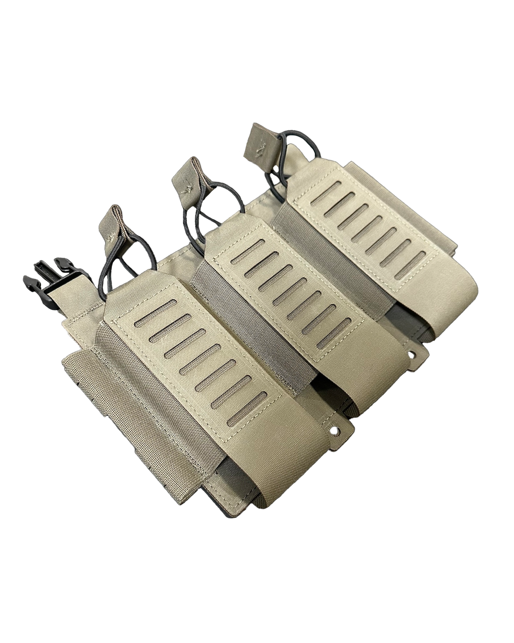 The TAC/TOE Triple 5.56 Placard features mini MOLLE on the face of each magazine cell, Velcro Hook backed for attaching to plate carriers, 2 elastic wings for chemlights and Sharpies and is Tubes compatible. The bottom of the placard also includes lashing points for attaching TQs, gloves, etc. and includes an active retention kit for retaining magazines.